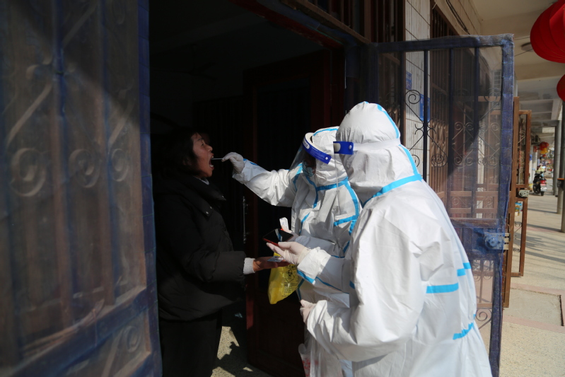 3月5日,連云港市海州區通報發生新冠肺炎疫情,形勢十分嚴峻。崗埠上下迅速行動起來,按照要求組織開展全員核酸檢測。全員核酸檢測要求一天內對崗埠所有在家人員進行檢測,農場四個點位同時開始,負責檢測的人員特別緊張。馬素蓮得知這一情況,主動和相關人員溝通,暫停了自家門診,帶領醫生錢冬梅、護士錢明霞加入了振興廣場籃球場監測點的核酸檢測人員隊伍。從3月5日到11日,她們三人一直堅守在核酸檢測一線,每天檢測人員合計達到兩三千人。有時候,她們需要配合網格員深入鎮區、生產區各居委會上門為行動不便的人員進行采樣,足跡遍布大街小巷,密不透風的防護服常常讓她們滿臉通紅透不過氣來。護士錢明霞告訴筆者,3月11日當天,她負責部分小區的核酸采樣工作,光是6樓就爬了6次,腿最后跟灌了鉛一樣,挪不動?!坝袝r候晚上嘴里吃著東西就睡著了。”