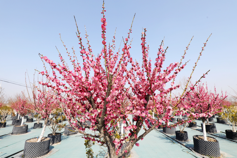 這片紅梅共有300多棵,其樹形、樹冠和花色,都是我們精心挑選和培育的,目前的市場價值也逐漸凸顯。”新洋林業(yè)公司負責人高翔介紹。