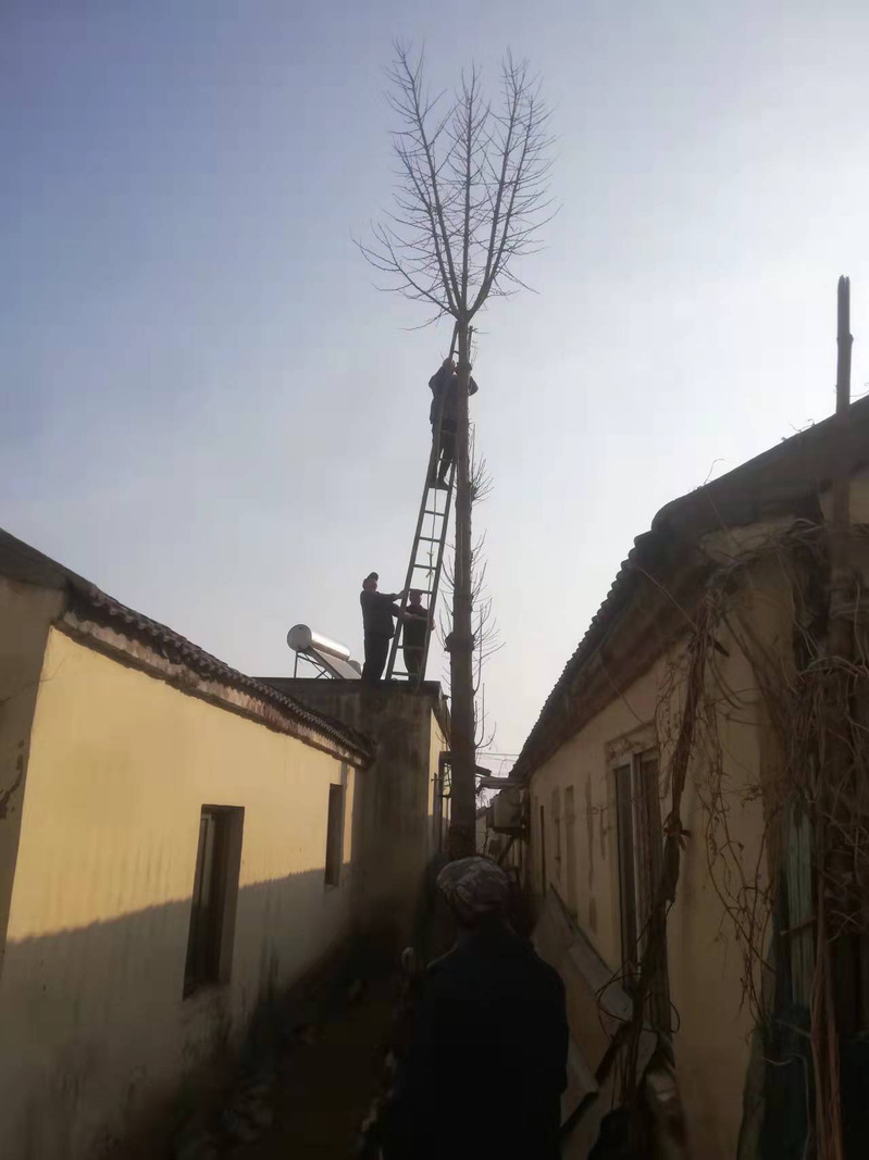 居委會接到反映后,立即對轄區各居民小區平房進行查看,轄區共發現三顆樹緊挨著居民住宅生長,其中最老的一棵樹樹齡有六十多年。居委會現場拍照取樣,直接將情況上報到農場安委會,安委會吳漢軍主任對居委會反映的情況非常重視,他本人于當日下午與居委會主任臧成龍再次來到現場查看確認后,現場要求臧成龍務必在一個星期內將這三棵樹砍伐,徹底消除隱患。
