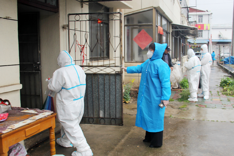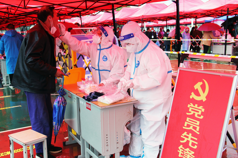 “我們是黨員,讓我們來”協助醫務人員采樣,要面對脫了口罩的人群,來自財務部門的3名女同志以特有的細心,快速高效地完成了工作任務。