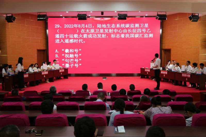 本次比賽分為兩個階段進行,在6月25日的預賽中,全場18支代表隊進行了筆試考核,通過每隊總比分,選出了今天6支參加決賽的隊伍。在主持人的宣布下,比賽正式拉開帷幕。“請聽題,黨的二十大報告指出……請開始搶答。”“請1號臺答題,三號臺搶答犯規(guī)……”在現場,6支代表隊“八仙過海各顯神通”,大家“邊賽邊學”、“以賽促學”,在必答題、搶答題和風險題3個環(huán)節(jié)上充分發(fā)揮團隊力量,傾力配合。各支代表隊你追我趕,互不相讓,臺下觀眾也聚精會神,對著屏幕學習黨的二十大知識,現場不時發(fā)出熱烈的掌聲。在每個環(huán)節(jié)休息階段,大會還組織開展了現場互動答題,并準備了精美禮品。現場觀眾紛紛踴躍搶答,再度將本次競賽活動氣氛推向了頂峰。