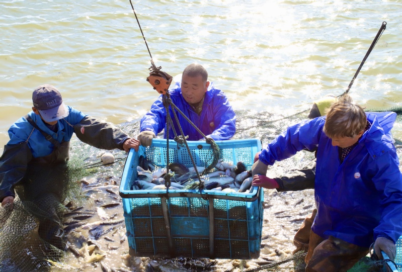 “起塘,出魚!”12月8日中午,在復(fù)興圩農(nóng)場(chǎng)有限公司鱸魚養(yǎng)殖園區(qū),集體養(yǎng)殖的加州鱸魚開始清塘出售,十幾名漁業(yè)工人正拖著漁網(wǎng)在精養(yǎng)魚塘里沿著塘口邊拖網(wǎng)捕魚,隨著漁網(wǎng)不斷收攏,成千上萬條鱸魚翻騰出水面,掀起陣陣?yán)嘶ā?