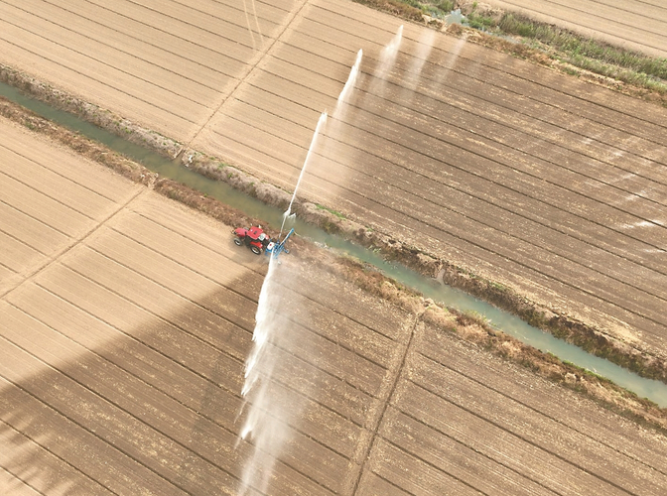 近日,在射陽縣淮海農場四分場剛播種的玉米大豆帶狀復合種植農田內,噴灌機正在田間進行抗旱作業(yè)。 陸軍 攝 (視覺江蘇供圖)