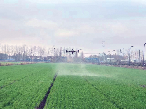 江蘇農墾淮海農場使用植保無人機對大小麥田莖葉處理化除,防除田間雜草。