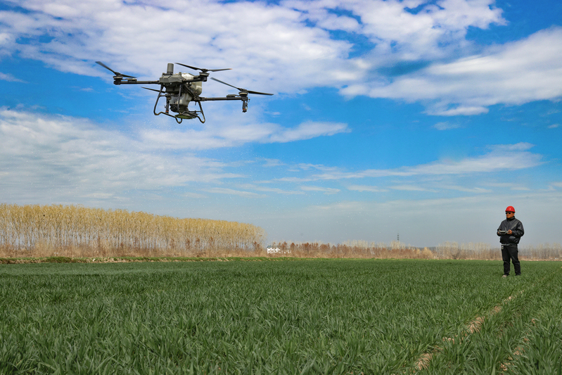 3月13日,江蘇省鹽城市射陽縣,在江蘇農墾新洋農場的一處高標準農田里,農技人員正在操縱一臺新式植保無人機,為小麥開展春季施肥作業。當前,新洋農場6萬畝高標準農業生產基地進入春管關鍵階段,該農場搶抓農時,積極開展春季田管作業,助力夏糧穩產增收。