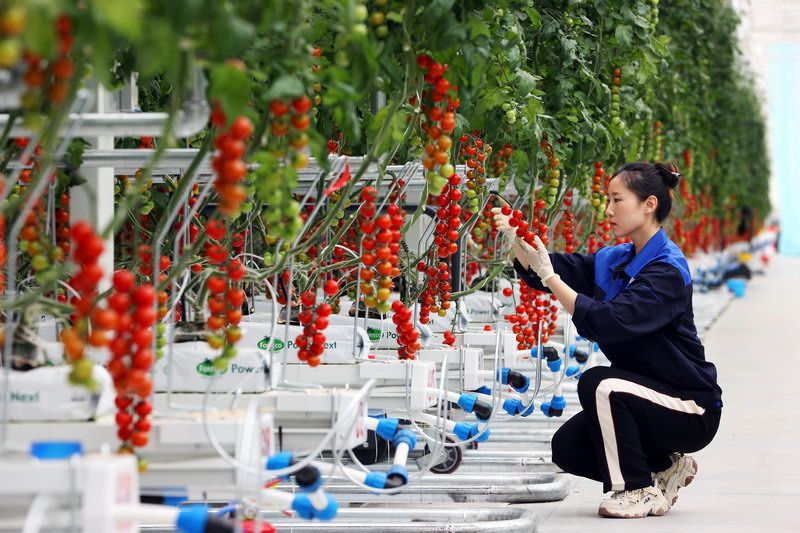 初夏時節,在位于海淀上莊的首農食品集團旗下“翠湖智慧農業創新工場”智能連棟溫室內,一排排高品質番茄正奮力汲取著養分向上生長。