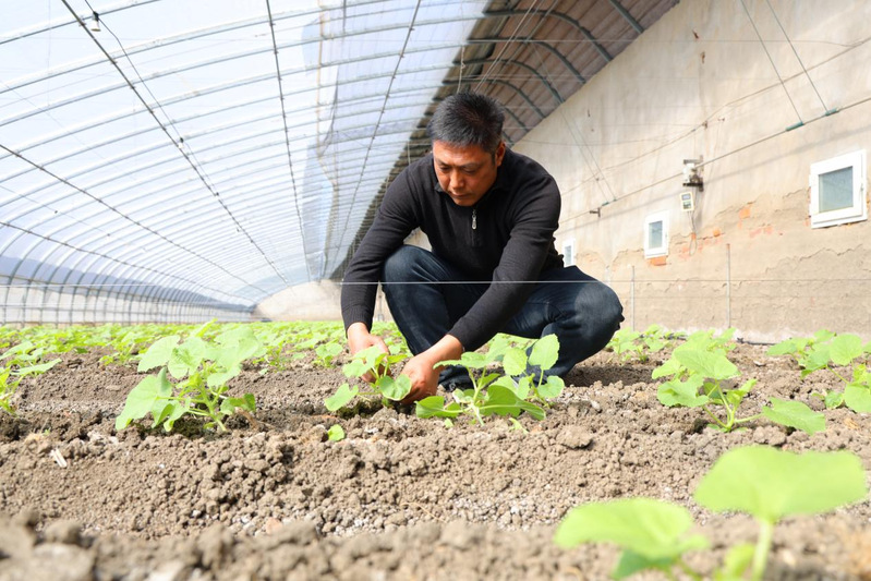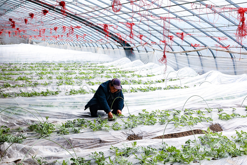 其他大棚里,也滿是搶抓農時的忙碌身影。園區27號大棚里,園區負責人魏建東正蹲在甜瓜苗前,仔細查看它們的長勢情況。“農時不等人,隨著瓜苗的生長,我們馬上要進行打杈、澆水,并進行覆膜除草。”魏建東介紹。打杈是為了去除瓜苗上多余的側枝,讓養分能夠集中供應給主枝和果實,從而提高甜瓜的產量和品質。澆水則是根據瓜苗的生長需求,適時補充水分,保證其正常生長。覆膜除草則可以減少土壤水分蒸發,抑制雜草生長,為甜瓜創造一個良好的生長環境。