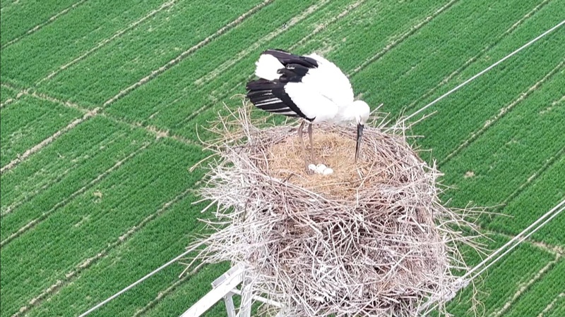 2月13日中午,宋婧用無人機拍攝農場里小麥生長的狀況時,發現一座高壓鐵塔上有兩只大鳥正忙著整理鳥巢,她在不驚擾到鳥兒的情況下進行觀察拍攝,發現鳥巢里有兩枚蛋。宋婧將視頻發給專業人士辨認,確認這兩只大鳥是國家一級保護野生動物東方白鸛。過了幾天,宋婧再次進行拍攝時,發現這對東方白鸛“夫妻”已經產下了四枚鳥蛋。