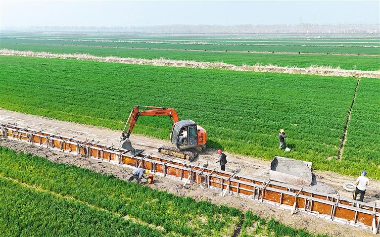 四月二日,施工人員在江蘇省連云港市崗埠農(nóng)場開展水利設(shè)施建設(shè),為糧食穩(wěn)產(chǎn)增產(chǎn)打好基礎(chǔ)。徐 衛(wèi)攝(中經(jīng)視覺)