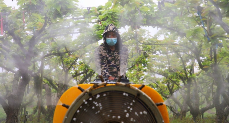 4月11日,在江蘇省南通市海門區的江蘇農墾江心沙農場,果農針對當前幼蟲體群集、裸露、不耐藥,病菌初侵染,葉片尚小等特性,搶抓防治最佳時機,操作自走式噴霧機在梨園里往返穿梭進行噴防作業。