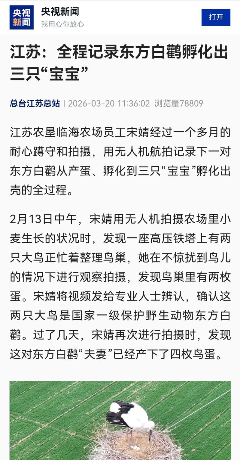近日,中央電視臺CCTV-13《新聞直播間》、CCTV-2《正點財經(jīng)》、央視新聞客戶端、江蘇新聞等權(quán)威媒體持續(xù)關(guān)注臨海農(nóng)場—— 一對國家一級保護野生動物、被譽為“鳥中大熊貓”的東方白鸛,在此筑巢產(chǎn)卵并成功孵化雛鳥!無人機記錄下東方白鸛產(chǎn)卵、孵化、育雛的完整過程,畫面溫柔治愈,讓臨海農(nóng)場的生態(tài)之美強勢“出圈”。中央電視臺CCTV-2《正點財經(jīng)》報道中央電視臺CCTV-13《新聞直播間》報道江蘇新聞視頻號報道央視新聞客戶端報道臨海農(nóng)場員工經(jīng)過一個多月的耐心蹲守和拍攝,用無人機航拍記錄下一對東方白鸛從產(chǎn)蛋、孵化到三只“寶寶”孵化出殼的全過程。2月13日中午,農(nóng)場工作人員在用無人機拍攝農(nóng)場里小麥生長的狀況時,發(fā)現(xiàn)一座高壓鐵塔上有兩只大鳥正忙著整理鳥巢,在不驚擾到鳥兒的情況下進行觀察拍攝,發(fā)現(xiàn)鳥巢里有兩枚蛋。工作人員將視頻發(fā)給專業(yè)人士辨認,確認這兩只大鳥是國家一級保護野生動物東方白鸛。過了幾天,再次進行拍攝時,發(fā)現(xiàn)這對東方白鸛“夫妻”已經(jīng)產(chǎn)下了四枚鳥蛋。經(jīng)過一個多月的觀察和拍攝,3月17日中午,發(fā)現(xiàn)兩只雛鳥破殼而出,一只東方白鸛時而臥在鳥蛋上,時而站起來用喙和腳撥動剩下的兩枚鳥蛋,而另一只東方白