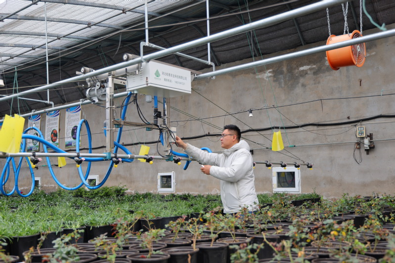 在崗埠農(nóng)場(chǎng),技術(shù)員正通過(guò)自動(dòng)化噴淋系統(tǒng)、智能溫控系統(tǒng)及實(shí)時(shí)監(jiān)測(cè)終端,對(duì)科技育苗大棚里的盆栽花苗進(jìn)行全面春季管護(hù),只需通過(guò)指尖的遠(yuǎn)程操作,通風(fēng)、控溫、噴淋等作業(yè)輕松完成。