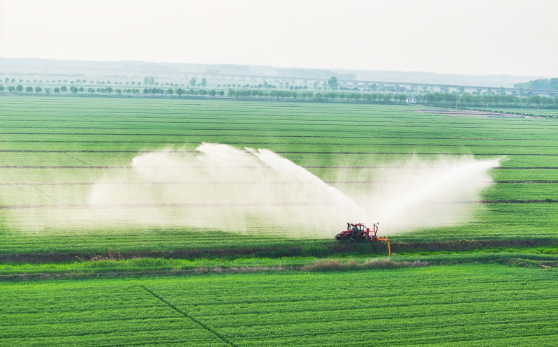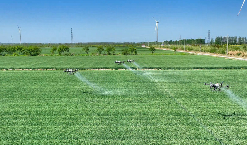 在蘇墾農(nóng)發(fā)新洋分公司新北生產(chǎn)區(qū)高標(biāo)準(zhǔn)農(nóng)田,五臺滿載生物藥劑的北斗導(dǎo)航植保無人機(jī)正沿著預(yù)設(shè)航線精準(zhǔn)噴灑葉面肥,多光譜測繪無人機(jī)同步監(jiān)測苗情長勢,全力守護(hù)麥田健康。新洋分公司將綠色防控與統(tǒng)防統(tǒng)治有機(jī)結(jié)合,所有基層一線青年員工全部掌握無人機(jī)操作技術(shù),實現(xiàn)了近6萬畝農(nóng)田的飛防作業(yè)全覆蓋。目前,共引入更新大疆T70、T100等新型無人機(jī)23臺。
