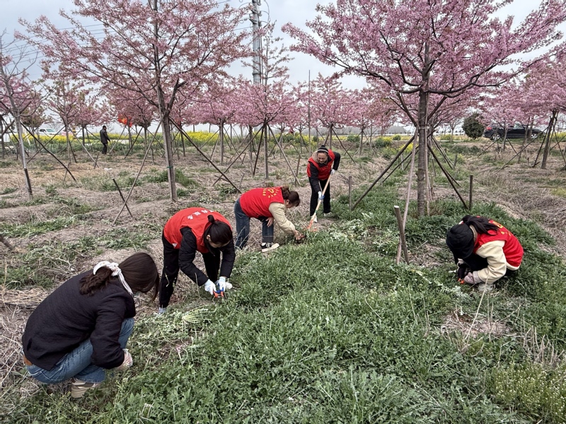 3月28日,白馬湖農場組織開展巾幗護林園志愿活動,穿著紅色馬甲巾幗志愿者們對各種雜草進行全面清理,忙碌身影與盛開的櫻花相互交織成一道亮麗的風景線。