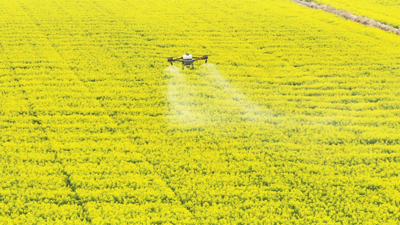 在蘇墾農發臨海分公司25大隊油菜田上空,一架植保無人機正按照預設航線低空勻速飛行,細密的藥肥均勻地噴灑在每一株油菜上。