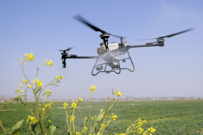 在省農墾三河農場邱上營分場的麥田里,植保無人機進行飛防作業。顏懷峰 錢厚紅 攝