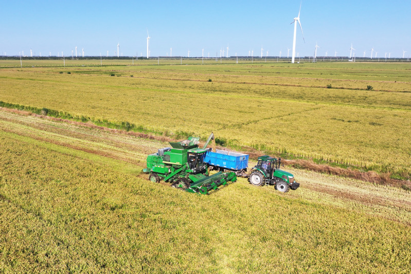 10月10日,江心沙農(nóng)場100余畝“低GI”功能性水稻喜迎豐收,農(nóng)機手駕駛收割機、運糧車來回穿梭,密切配合,確保顆粒歸倉。