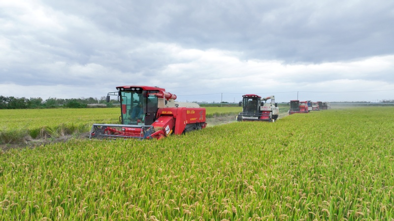 2025年10月10日,蘇墾農(nóng)發(fā)崗埠分公司正在搶收水稻。秋收時節(jié),天氣復雜多變,給秋收工作帶來一定困難,崗埠分公司按照“成熟一塊、收獲一塊”的原則,組織200多臺收運機械,集中力量加緊進行機械搶收作業(yè),確保成熟玉米、水稻等秋糧及時歸倉。
