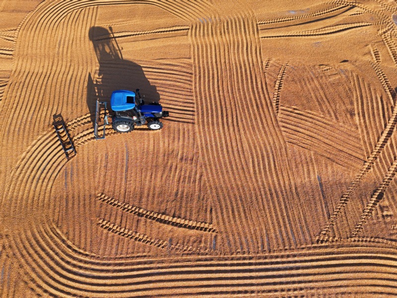2025年10月9日,江蘇農(nóng)墾崗埠農(nóng)場(chǎng),職工駕駛糧食翻曬機(jī),利用晴好天氣抓緊翻曬剛剛收獲的玉米,確保秋糧顆粒歸倉。